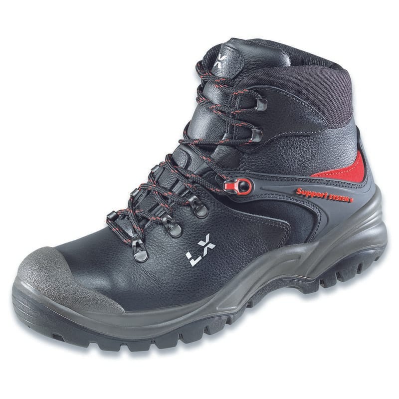 Brede neus. Beschermende PU-neus tegen slijtage. Uitneembare inlegzool. Cambrelle binnenvoering. Volnerf rundlederen schacht. Nitril/PU-zool. Stalen neus en stalen tussenzool. Hoog model.