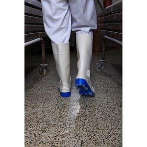 Degelijke anti-slip zool. Sterk dankzij nitril. Soepel en goed bestand tegen lage temperaturen. Blauwe zool. PVC/nitril-kwaliteit. Stalen neus. Wit.