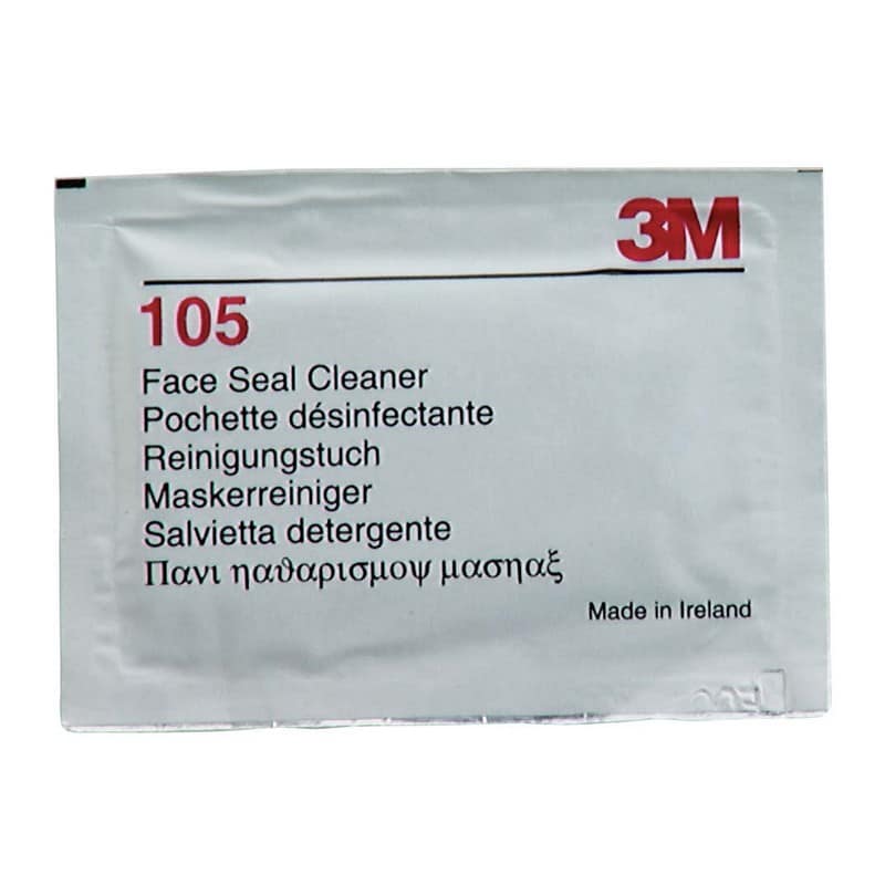 Het 3M 105 maskerreinigingsmiddel is een individueel verpakt doekje om het gelaatstuk te reinigen en op te frissen zonder het te beschadigen. Reinigingsmiddel voor gelaatsafdichting van herbruikbare maskers. Desinfecterend doekje.