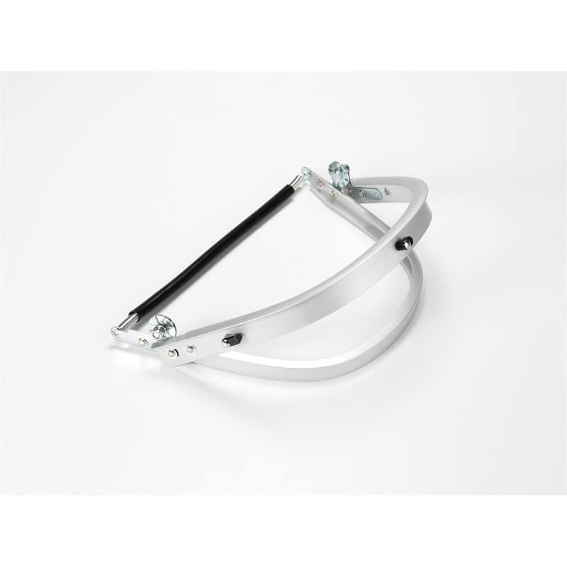 Aluminium schermhouder. Past op heel wat types helmen met een klep. De veer sluit goed aan op de achterzijde van de helm. Opklapbaar. Gelaatsscherm afzonderlijk te bestellen.